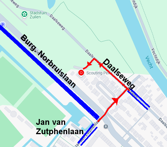 De meeste parkeerruimte vind je langs de Burgemeester Norbruislaan. Er is al heel lang geen bruggetje meer tussen de Burgemeester Norbruislaan en het troephuis.